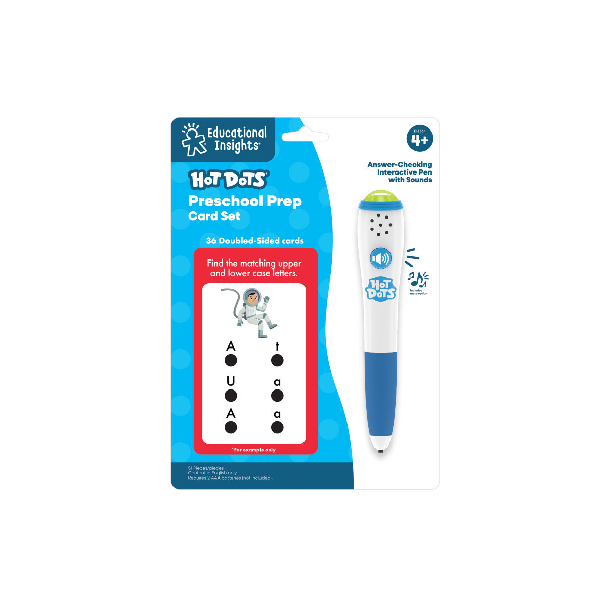 Get your kid ready for preschool! Hot Dots is an activity book, paired with an answer-checking interactive pen, that covers all the essentials skills for preschool. Read the question, press the tip of the pen to a black answer dot, and get instant feedback from the pen. The pen turns green for correct answers and red for incorrect answers. The pen does not talk or read answers; it can also be muted for quiet learning. Learn essential preschool skills like letter and number recognition, counting, letter sounds, and more! Includes 36 double-sided activity cards with ABCs and 123s and interactive Hot Dots pen. For ages 4+. Pen requires 2 AAA batteries (not included).