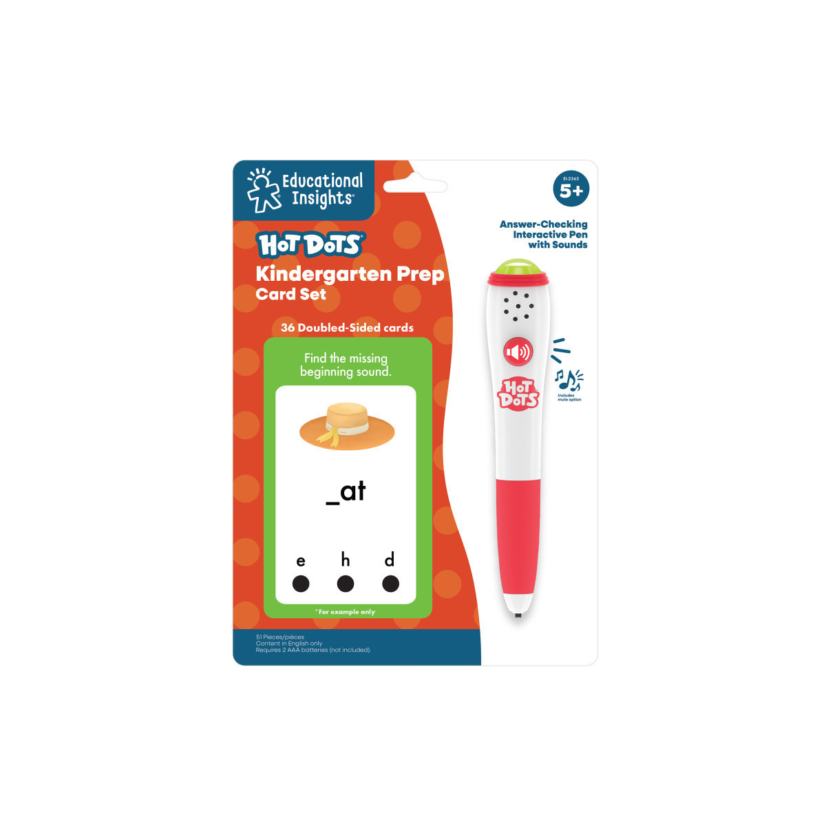 Prepare kids for kindergarten! Hot Dots is an activity book, paired with an answer-checking interactive pen, that covers all the essentials skills for kindergarten. Read the question, press the tip of the pen to a black answer dot, and get instant feedback from the pen. The pen turns green for correct answers and red for incorrect answers. The pen does not talk or read answers; it can also be muted for quiet learning. Learn essential kindergarten skills like rhyming, early reading and spelling, counting, addition, subtraction, and more! Includes 36 double-sided activity cards with ABCs and 123s and interactive Hot Dots pen. For ages 5+. Pen requires 2 AAA batteries (not included).