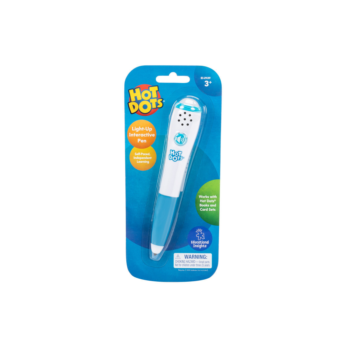 Kids can learn all on their own with the Hot Dots Light-Up Interactive Pen! Simply press the pen to any answer dot on one of dozens of Hot Dots and Hot Dots Jr activities for instantaneous audio and visual feedback. Lights and sounds indicate right and wrong answers, enabling kids to learn and practice critical learning skills independently, at their own pace, at home, in the classroom, or on the go! Each pen requires 2 AAA batteries, not included. Sold as 1 pen.