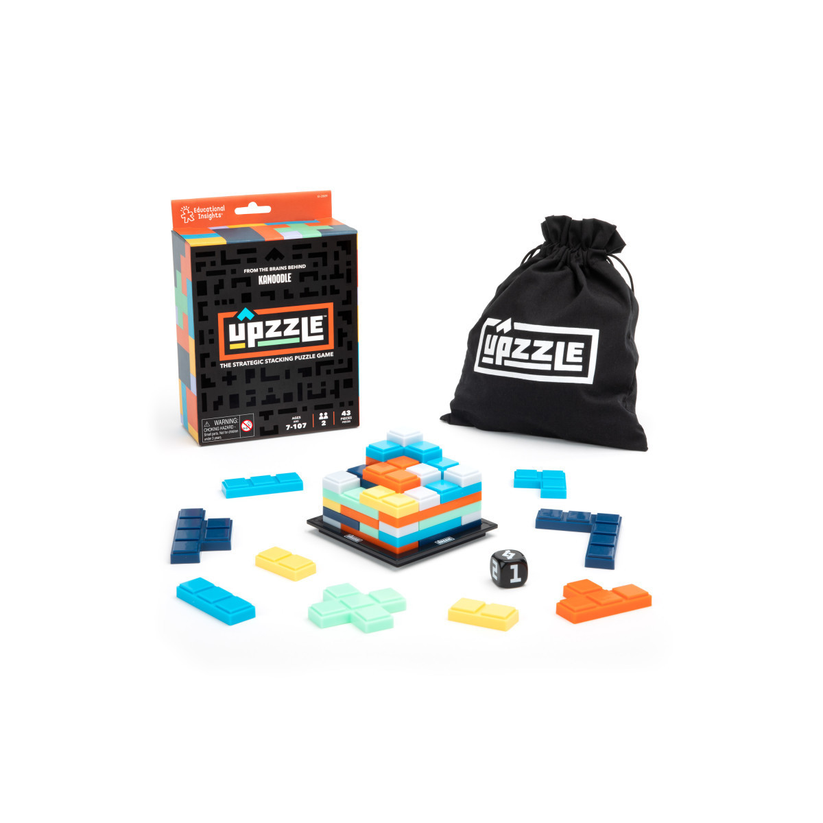 The strategic stacking puzzle game. Roll the die, then stack your puzzle pieces without bridging gaps or hanging off the board. The first player to use all their pieces wins! Includes 40 Upzzle pieces, game board, die, and drawstring storage bag.