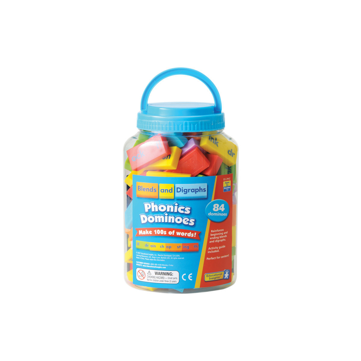 The phonics fun (and learning) stacks up with these colorful dominoes! Add the fun of game play to literacy centers with dominoes. Supports hands-on explorations of phonics and word building. Features the most often used consonants and word families so children can build hundreds of words. Includes 84 dominoes in 6 bright colors, Activity Guide, and sturdy plastic storage jar with lid. Grades 1+. Ages 6-9 years.