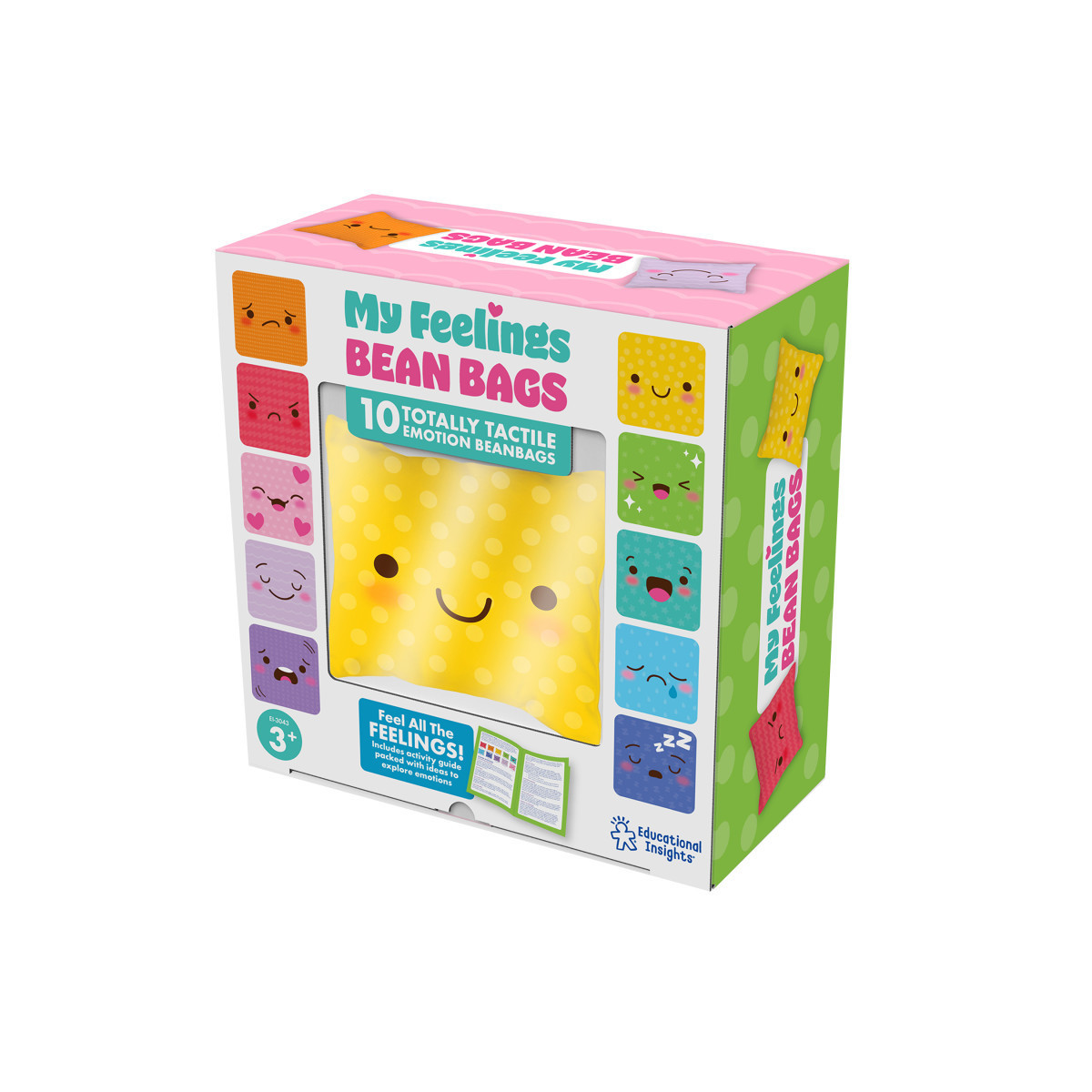 - INCLUDES: Ten 4"x4" beanbags, each featuring a different color, texture, and emotion; drawstring carry bag; and parent/teacher activity guide. Emotions depicted include happy, sad, angry, surprised, loved, scared, peaceful, excited, sleepy, and disappointed. Textures include sateen, felt, corduroy, non-woven, cotton, synthetic leather, linen, polyester, and two types of nylon.