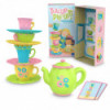 - INCLUDES: Eight plastic teacups, four saucers, 10 order cards, a teapot, two tea serving trays, and teacup cupboard (box bottom).