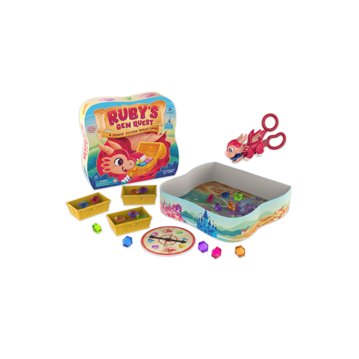 INCLUDES: Ruby scissor scooper tool, 20 gems in five colors, spinner, four treasure chests, guide, and game board (doubles as package!)