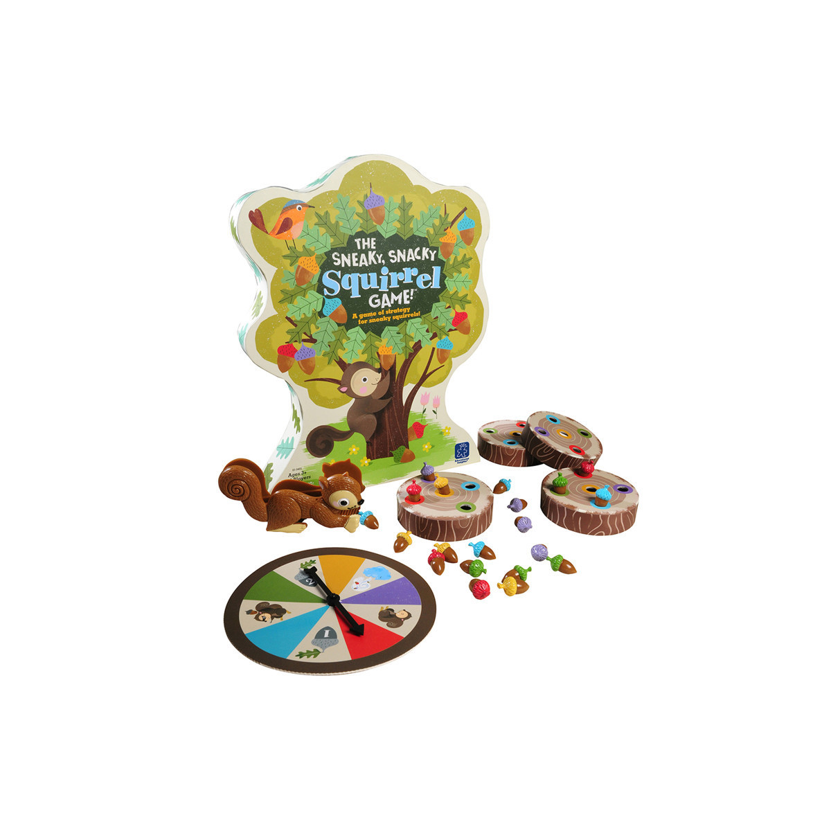 Your forest friends are hungry and they need your help! Spin the spinner, squeeze the matching colored acorn with your Squirrel Squeezer, and place it into your log. Be the first to fill your log with delicious acorns and you win! You could also spin "pick an acorn," "steal an acorn," or "lose an acorn," so be strategic, little squirrel! Ages 3-5 years.