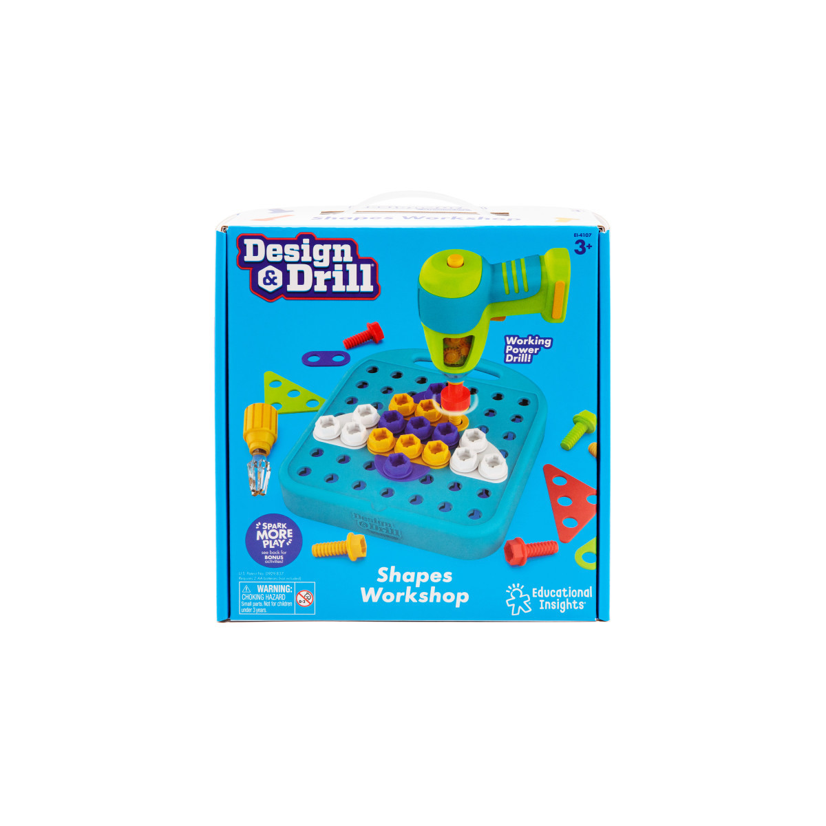Spark More Creativity! Let's try something new! Educational Insights toys and games provide opportunities for self-expression, creativity, and imagination, helping kids identify new interests, appreciate their own strengths, recognize and overcome challenges, and build their self-confidence. Construction meets creativity with this STEM learning set! Preschoolers use a kid friendly power drill, decorative design plates, and matching bolts to create colorful works of art. Includes activity board with handle, drill, screwdriver, 24 plates, 44 bolts, and activity guide with playful patterns to follow. Manipulating the cards, drill, plates, and bolts builds the hand-strength, hand-eye-coordination and fine motor skills kids need to hold a fork and button their shirts