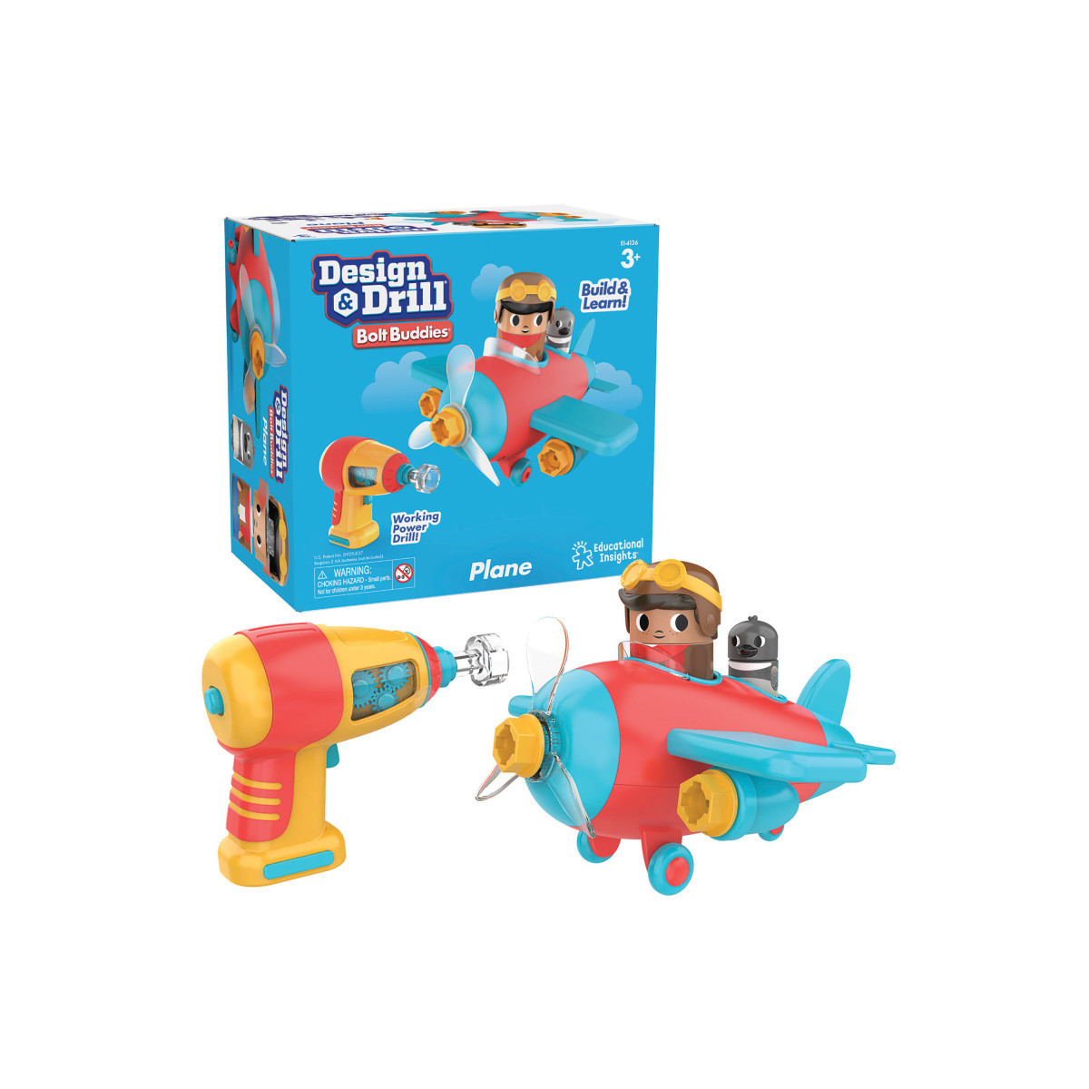 - INCLUDES: Kid-friendly power drill toy, seven decorative bolts, five snap-together plane pieces, and pilot and co-pilot figurines. Drill requires 3 AAA batteries (not included). Drill Patent No. US D929,837