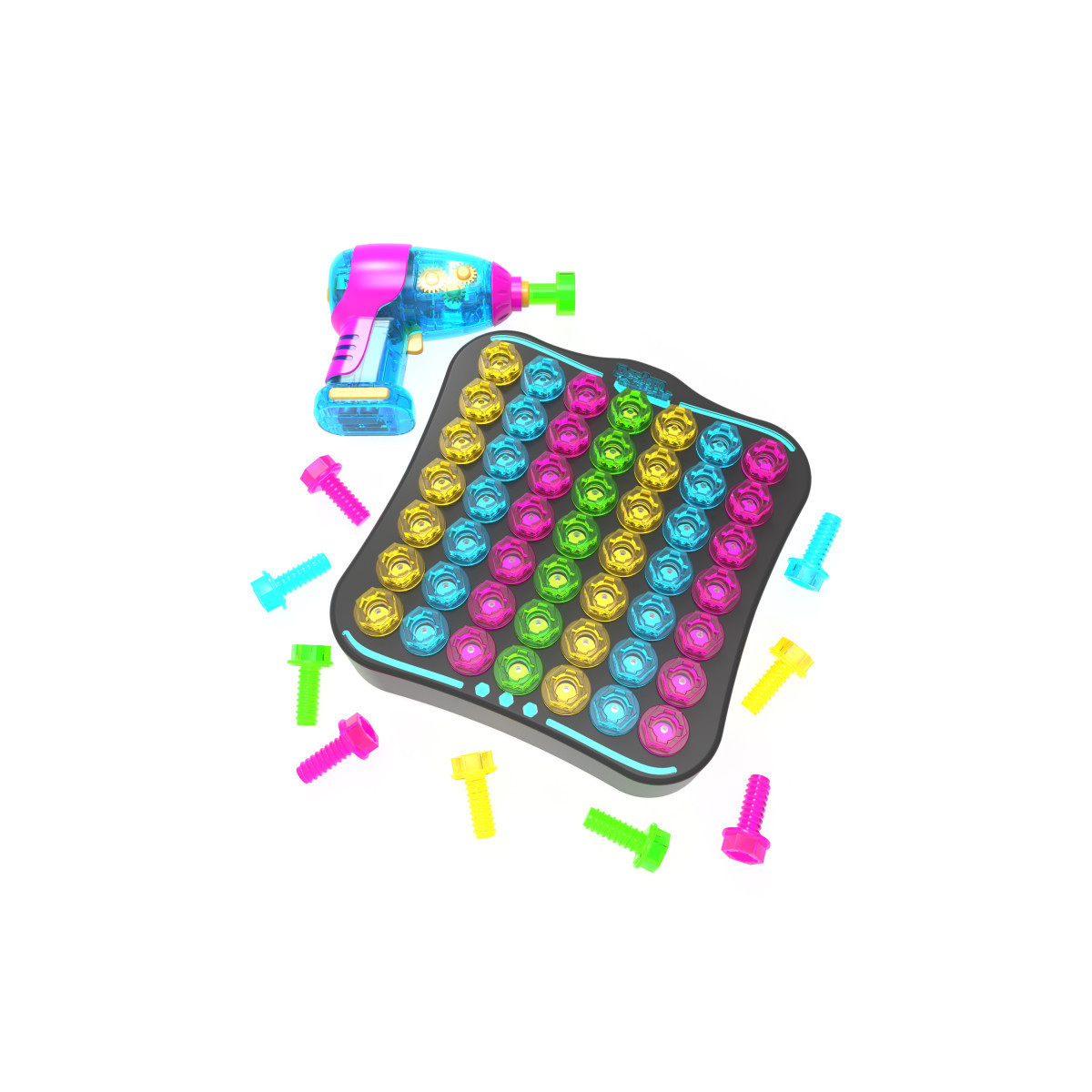 - INCLUDES: 7.5" x 7.5" Design board, translucent motorized drill with Philips bit, 50 colorful translucent bolts, and activity guide. Requires 2 AA and 3 AAA batteries (not included). Drill Patent No. US D929,837