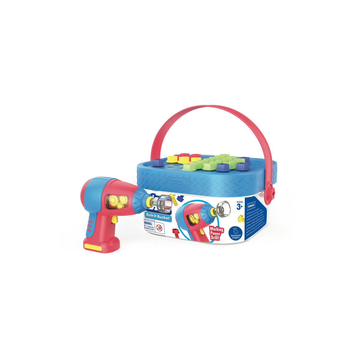 - Includes see-through bucket with handle and activity board lid, 52 bolts in 4 different colors, kid-friendly drill, and guide with patterns.