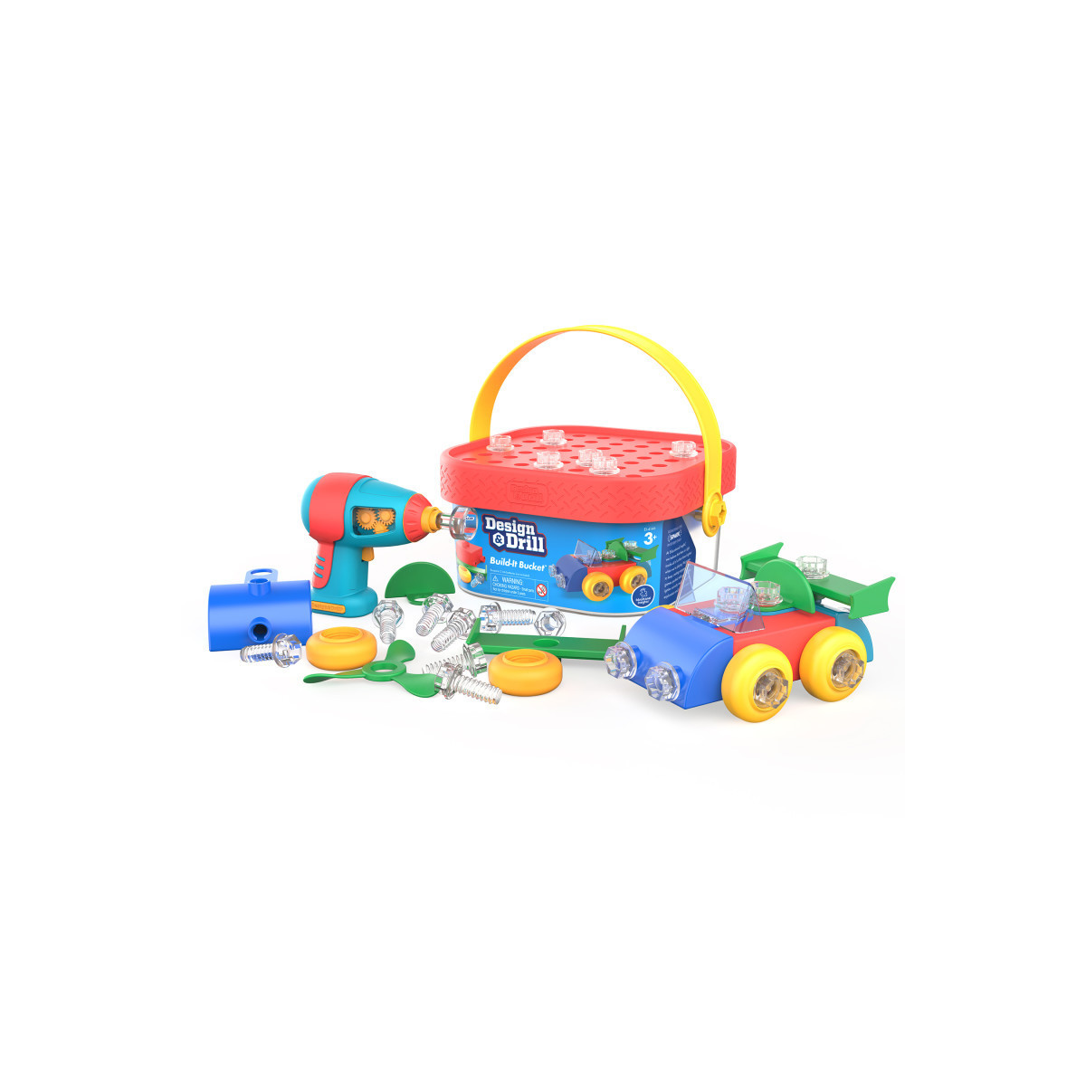 - PORTABLE DRILL TOY: Busy builders can bring this drillable construction set with them for construction fun on the run. The bolts, drill, and other parts and pieces fit easily inside the bucket for on-the-go building and fun