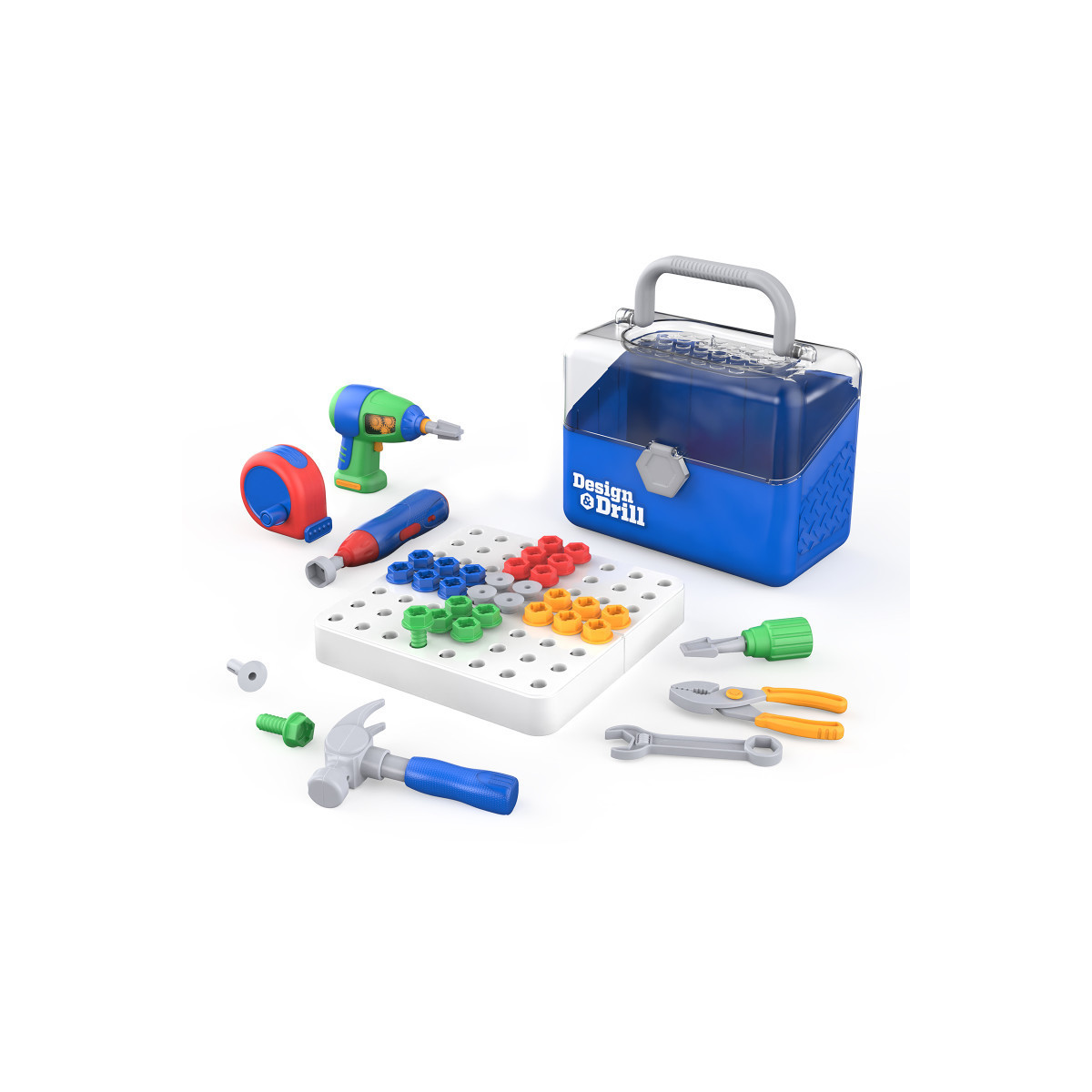 - Little builders can drill, hammer, measure, and more with the Design & Drill Toolbox, packed with real, working tools kids can call their own