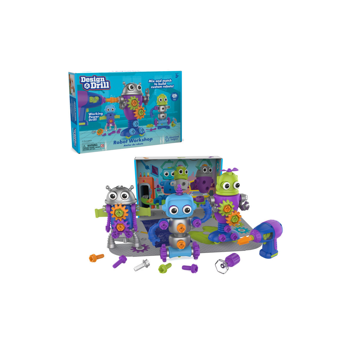 Robot designers, welcome to your lab. Customize your robots by mixing and matching pieces. Includes kid-friendly drill, socket bit, screwdriver, 32 bolts, 26 interchangeable pieces, seven gears, and sticker sheet. Requires 2 AA batteries (not included). Drill U.S. Patent Number D929,837.