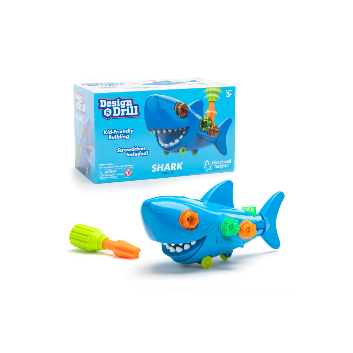 INCLUDES: Eight colorful bolts, snap-on parts, kid-friendly screwdriver, Phillips bit and wheels on the shark's belly. Ages 3+
