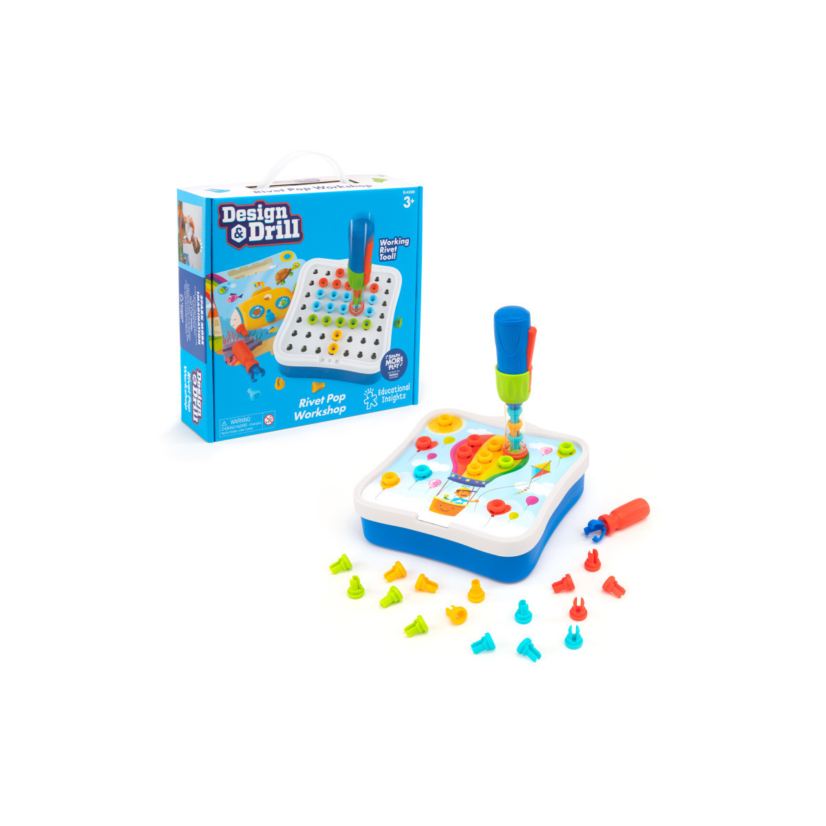 - Pop into early learning! Busy builders use a hand-powered rivet tool and rivets that "pop" when they're placed to complete the colorful patterns on the included cards