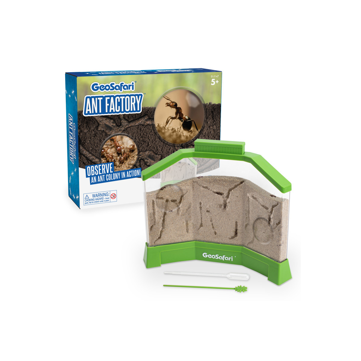 Explore the amazing world of ants up close with the GeoSafari Ant Factory – with sand! Set includes everything kids need to raise and observe an ant colony, including an escape-proof ant habitat with large viewing area, magnification spots, and stand; special ant sand; feeding tool, and certificate to receive live ants. Settle your ants and watch as they work together to tunnel, eat, sleep, and more. Perfect for young entomologists; provides a 360°-view of one of the world's most industrious insects! Includes activity guide and mail-in certificate for Harvester Ants ($4.00 shipping and handling not included).