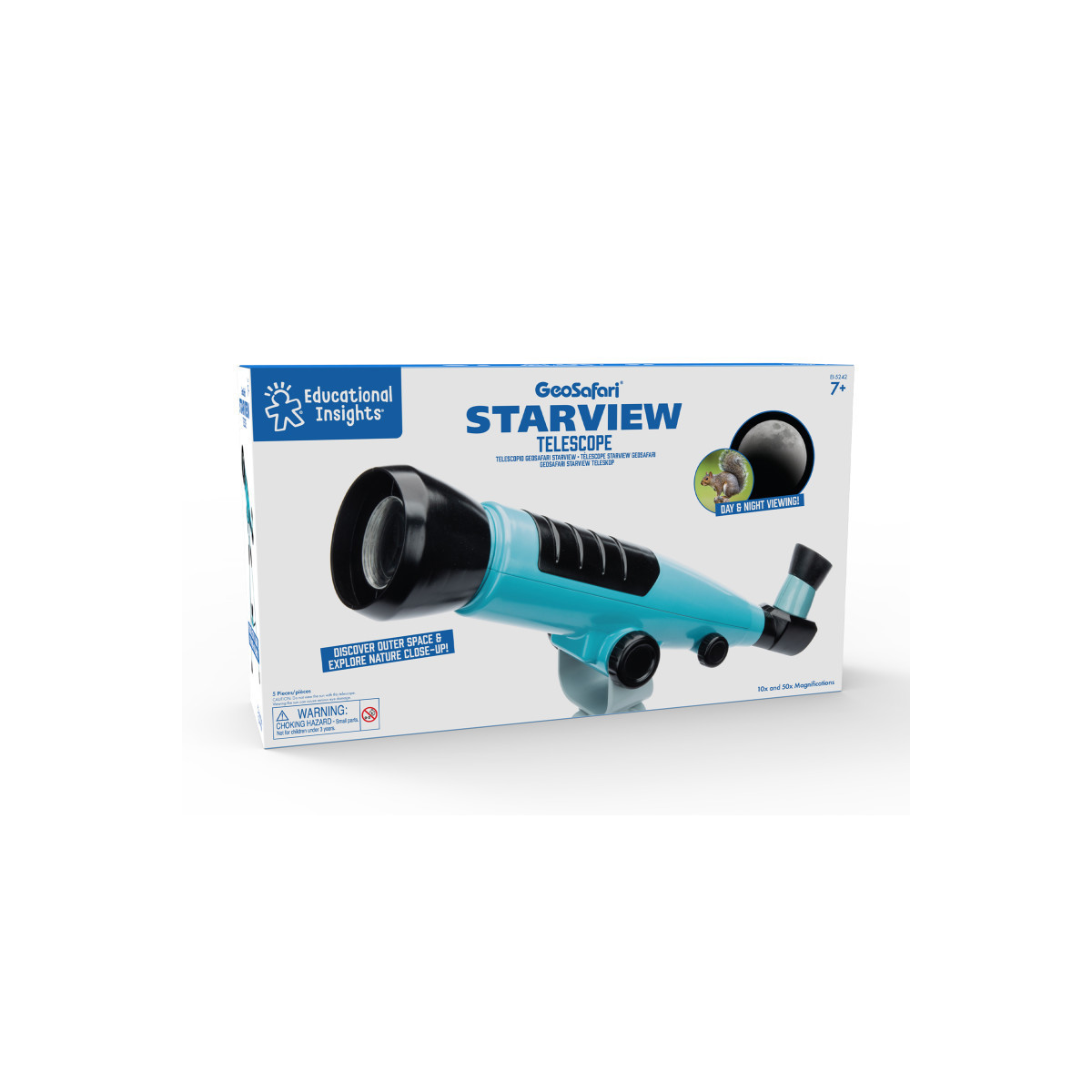 - Includes telescope with tripod, two magnifying lenses (10x and 50x), and activity journal with experiments.