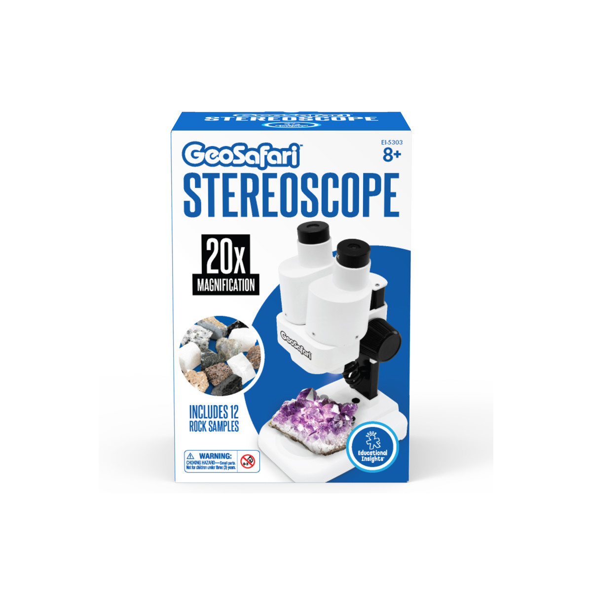Get up close and personal with a variety of 3-D objects with the GeoSafari Stereoscope, a fully functional microscope with up to 20x magnification! The Stereoscope features 10x and 20x magnification eyepieces, an easy-focus knob, and a sturdy viewing stage with a top-mounted LED light for a magnificent, magnified view of opaque objects like fossils, rocks, insects, and more!