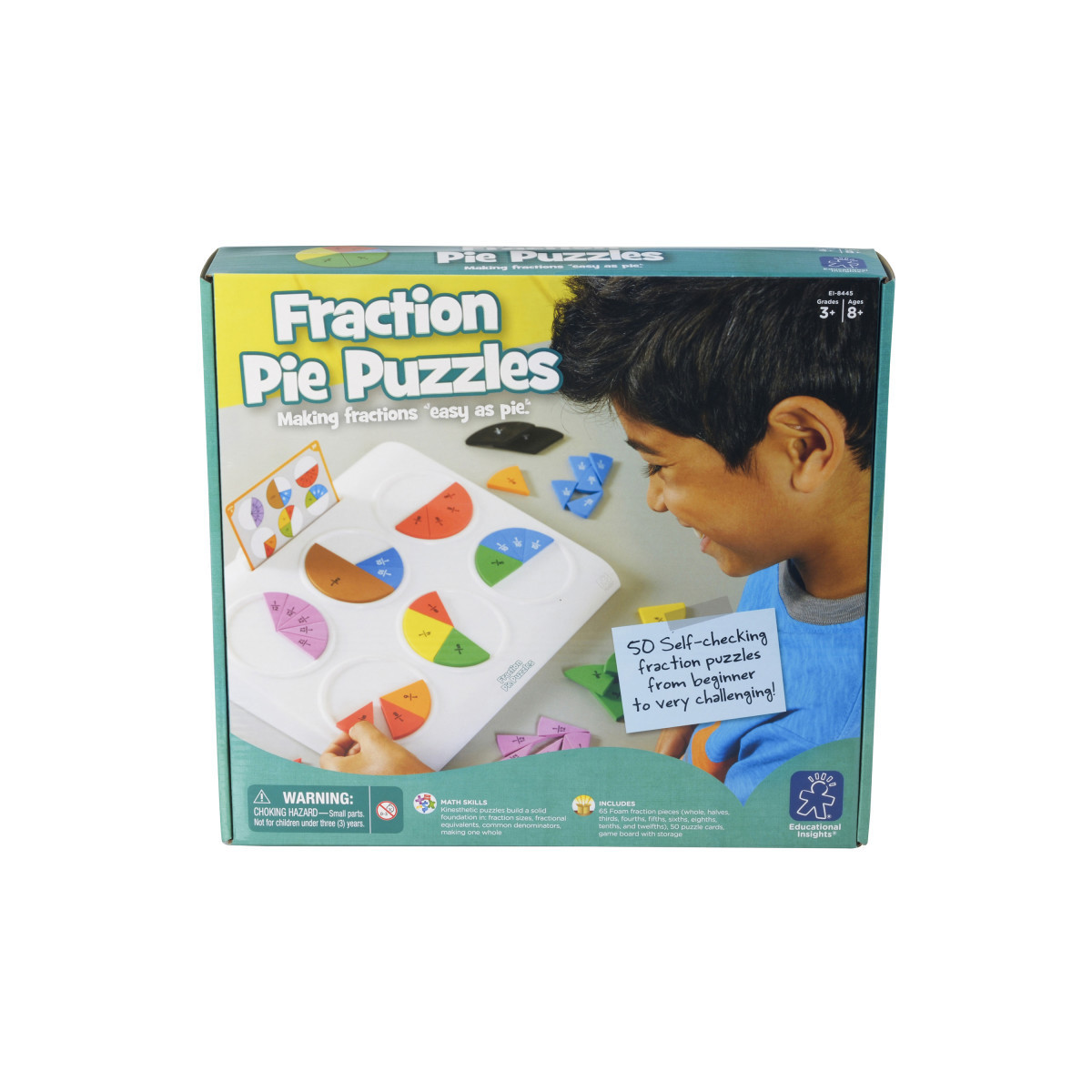 - Includes game board, 5 leveled puzzle cards, 65 foam fraction pieces, guide, and solutions.