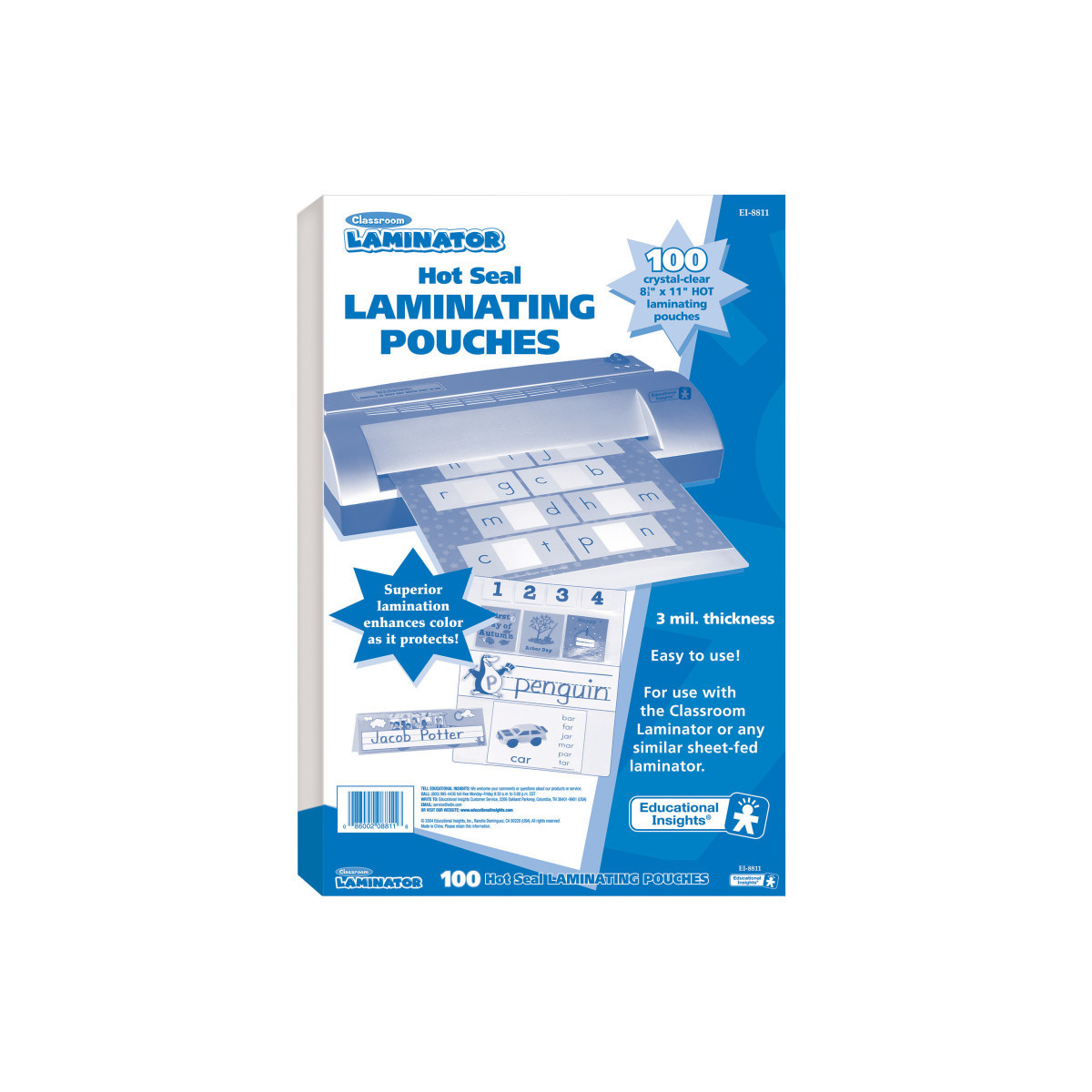 Works with our convenient and compact Personal Classroom Laminator. Includes 100 laminating pouches. Protects student work, photos, bulletin board decorations, name tags and much more. Makes it easy to create write & wipe classroom materials students can use over and over again with dry-erase markers or crayons. Allows lamination of documents up to 8.5" x 11".