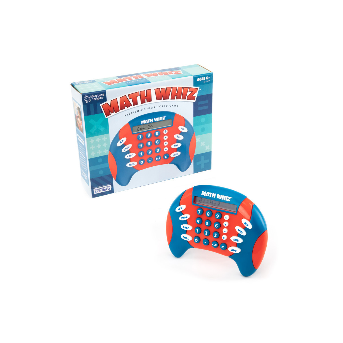 - WHAT'S INCLUDED: Math Whiz is a hand-held electronic game with three modes of play (Drill, Challenge, and Calculator) that quizzes kids on addition, subtraction, multiplication, and division facts at 8 difficulty levels for each skill. Requires 2 AAA batteries (not included).