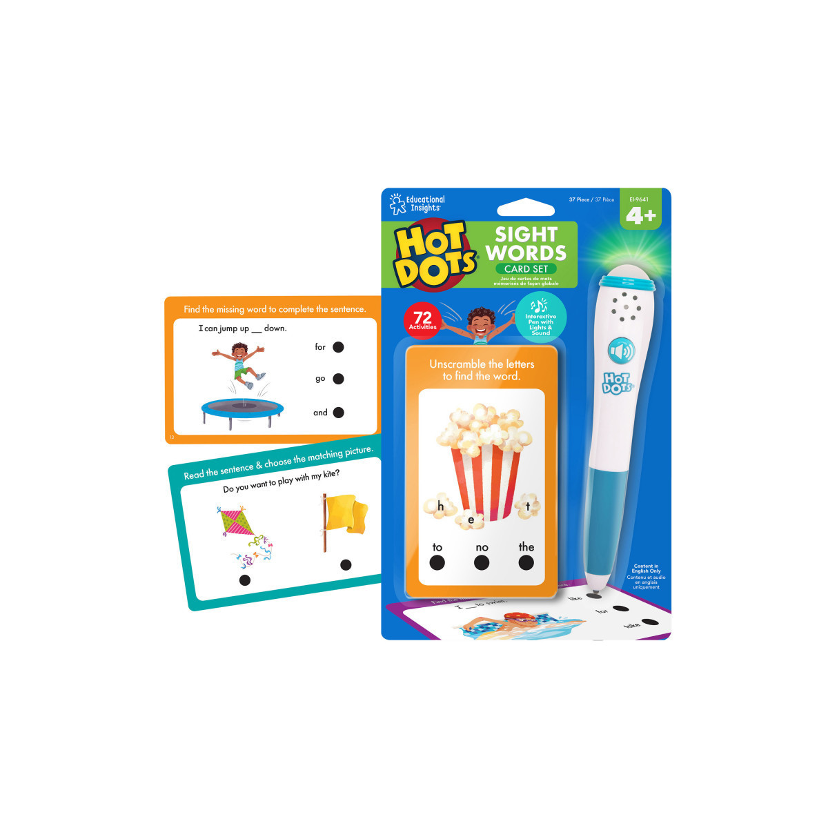 Build reading fluency and learn beginning sight words with hands-on, independent activities that let kids learn at their own pace. Set includes 36 double-sided cards (72 self-paced activities) and interactive Hot Dots pen.