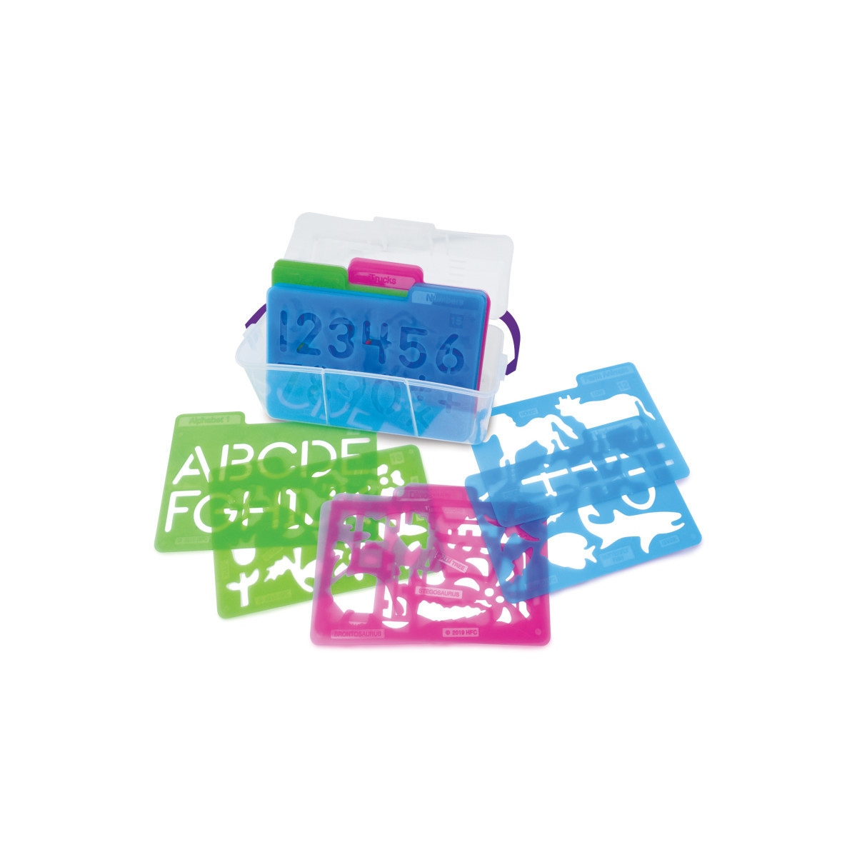 These durable plastic stencils are perfect for creating greeting cards, picture books, signs, posters, wrapping paper, story illustrations, and a whole lot more! This set of twenty-four 3 5/8" x 5 13/16" stencils with 160 images comes complete with sturdy storage case with room for colored pencils, markers, etc. The case has a removable carry handle for on-the-go artists.