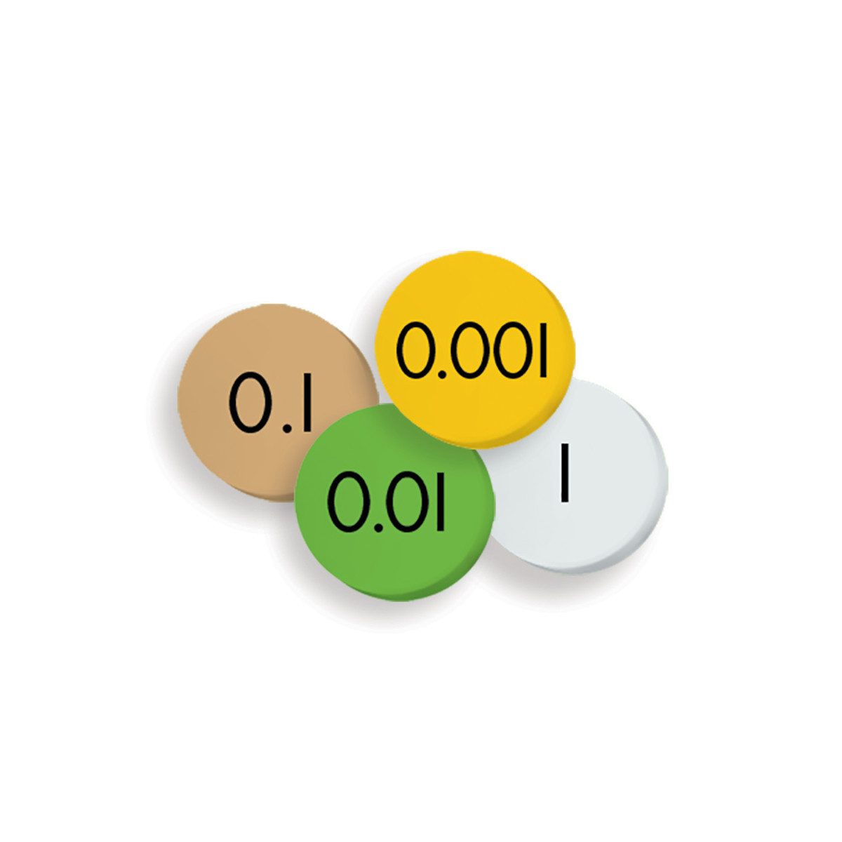The hands-on way to visualize numbers and operations! These easy-to-manipulate discs provide hands-on practice for developing number sense. Color-coded according to place value, the foam discs allow students to visually track what happens when they regroup numbers in both addition and subtraction. And they help illustrate that multiplication is the same as repeated addition, and division the same as repeated subtraction. Packaged in re-sealable poly bag for easy storage. Discs are 1" in diameter, 1/8" thick, and made of EVA foam for easy manipulation and quiet classroom activity. 25 each of 4 values - 0.001, 0.01, 0.1 and 1. 100 total discs in set.