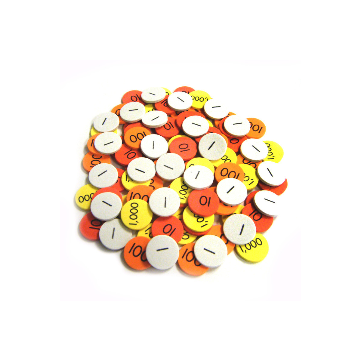 These easy-to-manipulate discs provide hands-on practice for developing number sense. Color-coded according to place value, the foam discs allow students to visually track what happens when they regroup numbers in both addition and subtraction. And they help illustrate that multiplication is the same as repeated addition, and division the same as repeated subtraction. Packaged in re-sealable poly bag for easy storage. Discs are 1" in diameter, 1/8" thick, and made of EVA foam for easy manipulation and quiet classroom activity. Each pack includes 600 Sensational Math™ Place Value Discs: 200 ones, 200 tens, 100 hundreds, and 100 thousands.