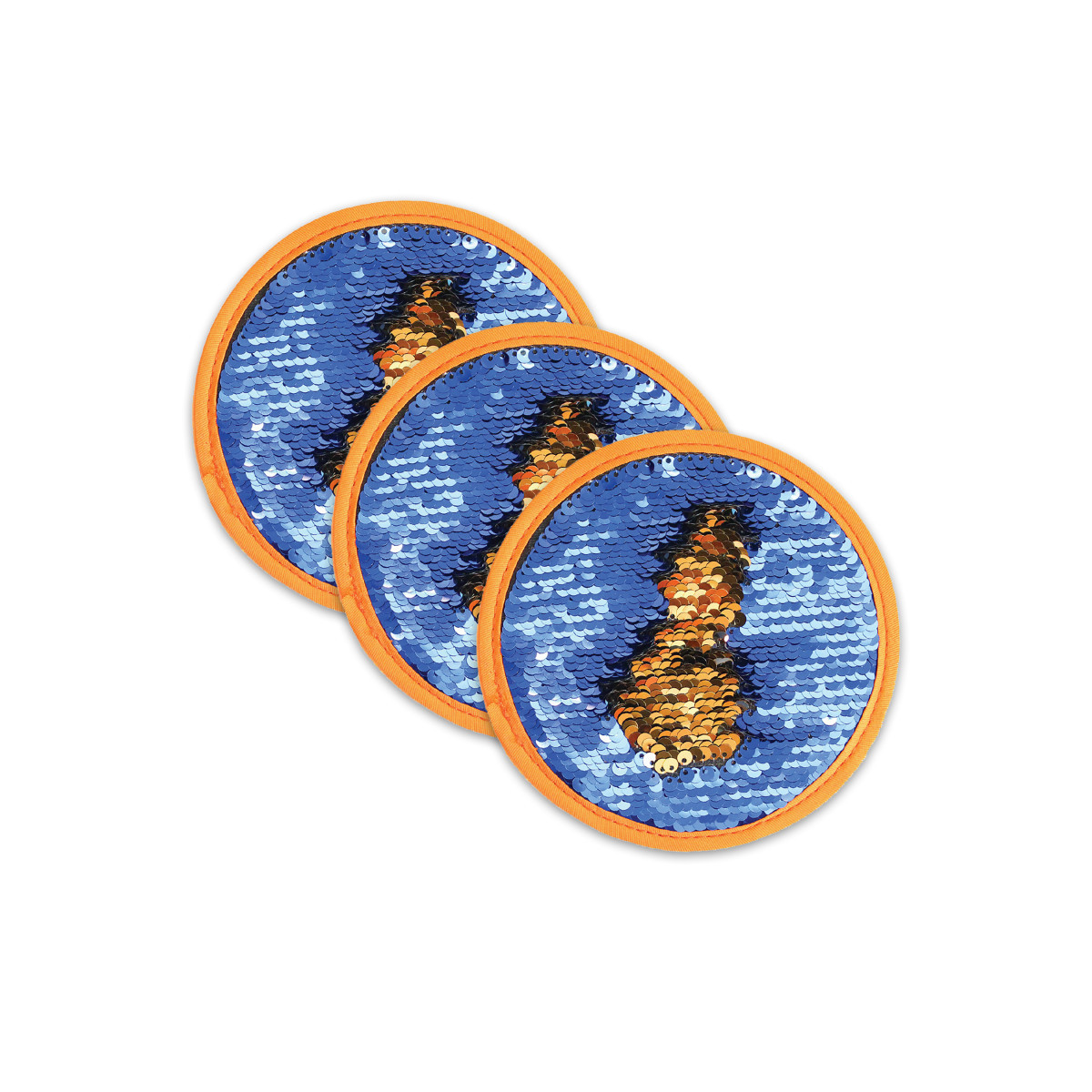 The special flip-flopping sequins have an iridescent quality that changes colors with light refraction. When a finger traces through the scaly maze of sequins they flip over and turn black leaving a design. Roll back in the opposite direction and they return to shimmering colors. Scaly stuff also has magnetic backing to adhere the disc to metal surfaces. Each pack includes 3 sensory discs.