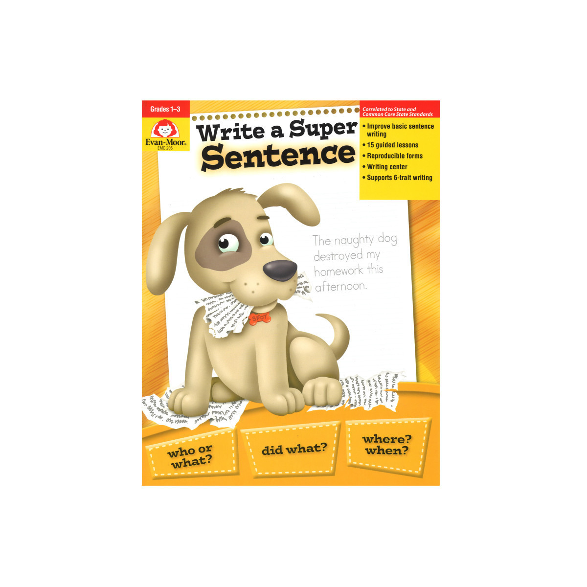 Our resources have been created by experts in the education industry and have been correlated to state standards. Each program comes with step-by-step directions that guide students through the who, what, when and where words and phrases. Get their creative juices flowing with our brainstorming activities and articles, reviews on adjectives, adverbs and verbs! Help motivate your grades 1 to 3 students with fun, thought-provoking exercises that support 6-trait writing and will even inspire the most timid writers. Your students will learn that writing can be fun and rewarding with "Write a Super Sentence" from Evan-Moor!