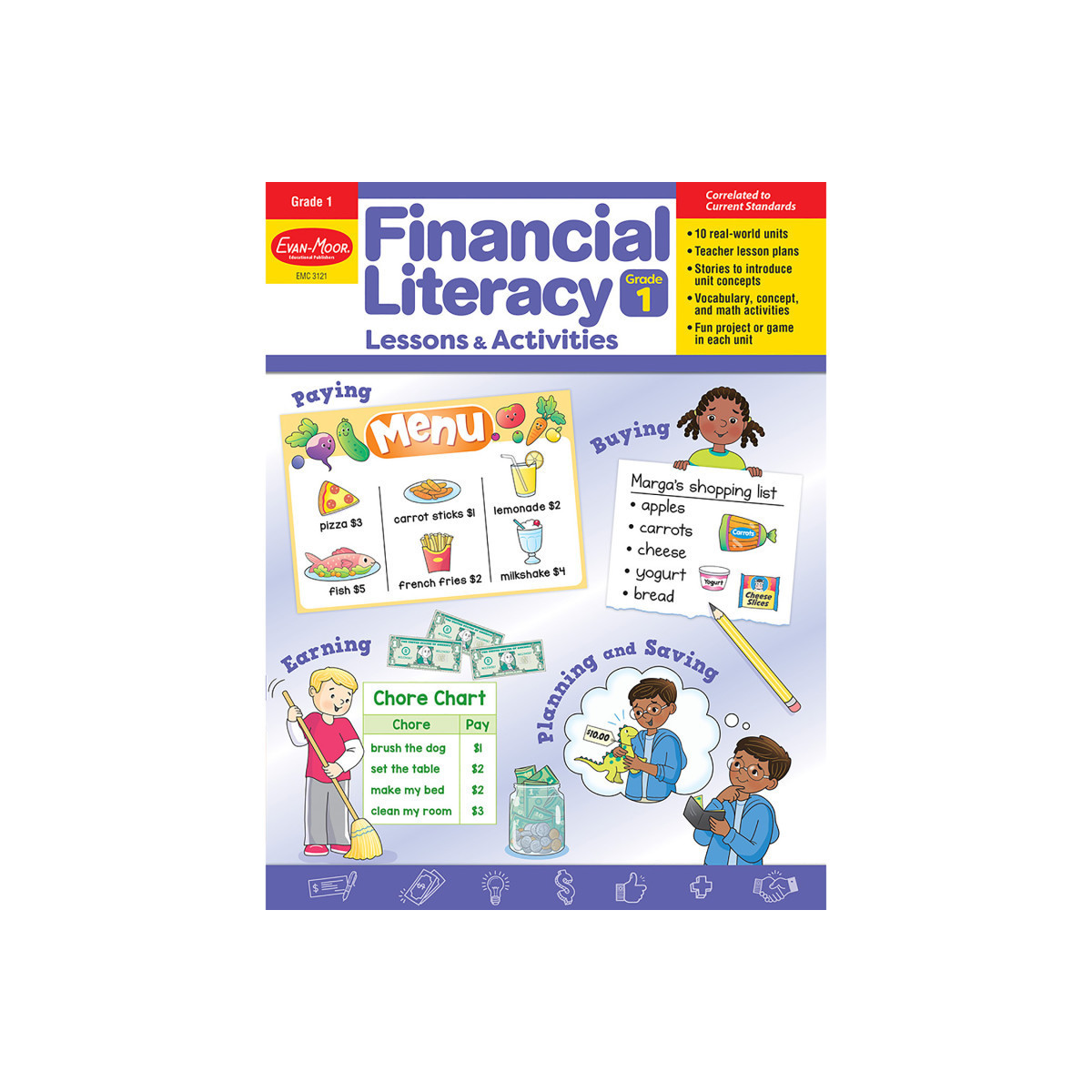 Financial Literacy Lessons and Activities Grade 1 is based on current national and state standards, and each of the 10 units includes: