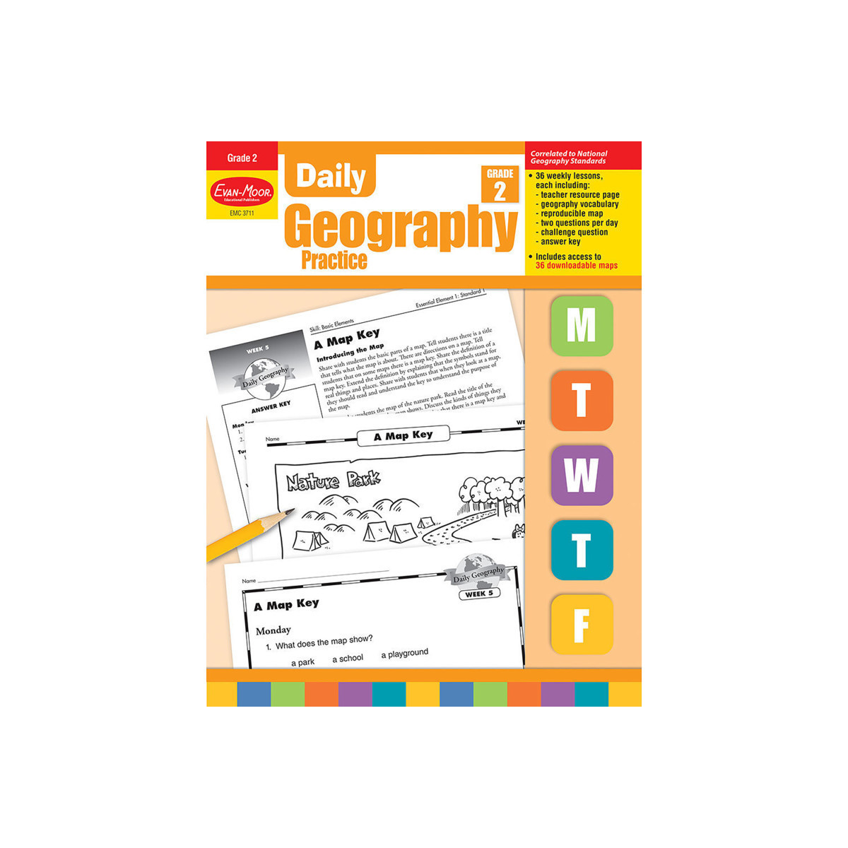 - In Daily Geography Practice, Grade 2, 36 map lessons introduce basic geography skills and over 80 geography terms