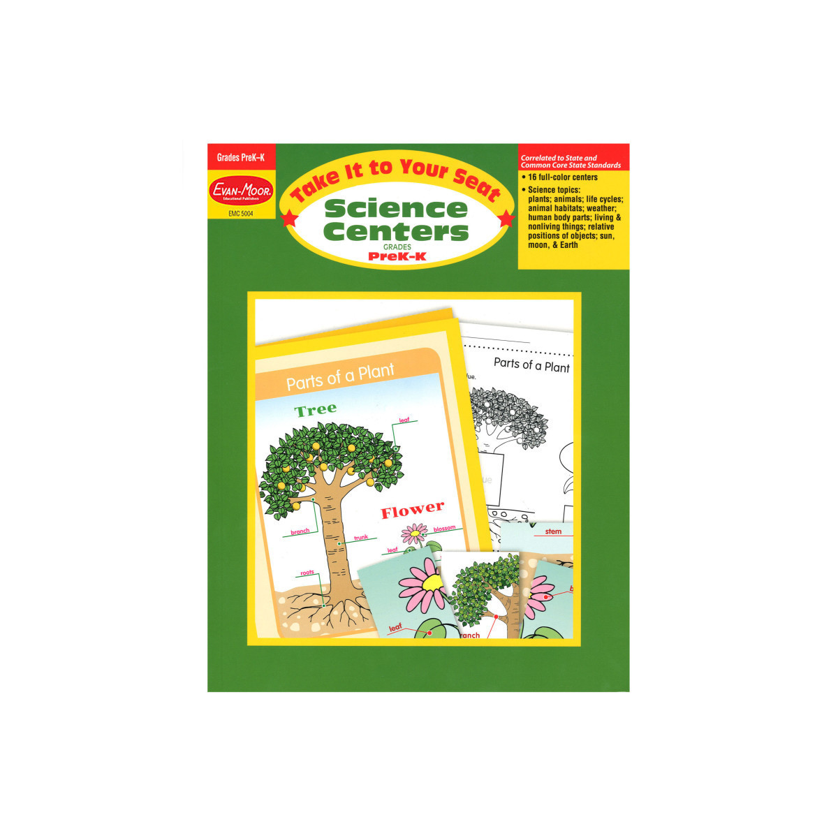Take It to Your Seat Science Centers, Grades PreK-K has everything you need for 16 centers that explore science concepts and practice literacy skills. These colorfully illustrated centers, stored in folders or plastic envelopes, are ideal for small groups and individual practice. The concepts covered include: identifying living and non-living things, relative position of objects, comparing and sorting by physical attributes, classifying plants and animals, understanding plant life cycles, understanding animal life cycles, identifying major structures of animals, identifying major structures of a plant, understanding where food comes from, identifying human body parts, understanding how weather affects our lives, identifying animal habitats, recognizing solid and liquid forms, and identifying sun, Earth, and moon.