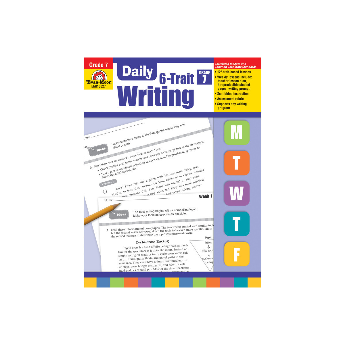 Daily 6-Trait Writing gives your seventh graders scaffolded, focused writing practice. Each of the 25 weekly units provides trait-based writing activities that cover the essential traits of strong writing: ideas, organization, word choice, sentence fluency, voice, and conventions. The weekly units present a writing skill on Day 1, and writing activities progress in difficulty until students apply what they've learned to a writing prompt on Day 5.