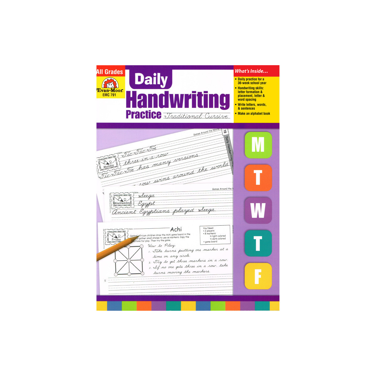Incorporated into the writing exercises in Daily Handwriting Practice, Traditional Cursive, are many other basic areas of learning important to developing minds. For example, on the topic, "What is work," students learn about simple tools and the physics applied in using them. Students write letters, words, and sentences about a variety of content area topics appropriate for the classroom. Monday through Thursday, the weekly subjects for writing exercises range from famous inventors to famous quotations, amazing hunters to the water cycle. On Friday, a full-page exercise draws the topic to a close by reviewing what was learned earlier that week. This book is a useful and effective teaching tool because: Each letter is introduced and practiced before students are asked to use it. Curriculum topics addressed include: the alphabet, unusual animals, math, capital letter, owls as hunters, rhyming words, months of the year, whales, rivers of the world, days of the week, the water cycle, world alphabets, geography, facts, synonyms, nonsense rhymes, the seven continents, color words, alliteration insects, weather, beavers, U.S. presidents, simple machines, famous quotations, unusual plants. Native American tribe, math ,rhyming words, sports around the world, Kenya, prefixes and suffixes, candy around the world, games around the world. Skills reinforced that help keep handwriting legible include: correct letter formation, letter placement, spacing between letters, and spacing between words. When students complete this book, they will take away a self-made learning tool, because the final four weeks of practice assemble into an Alphabet Book about insects. Engaging line art illustrations highlight various exercises. All 112 pages are reproducible for classroom use and perforated for easy removal.