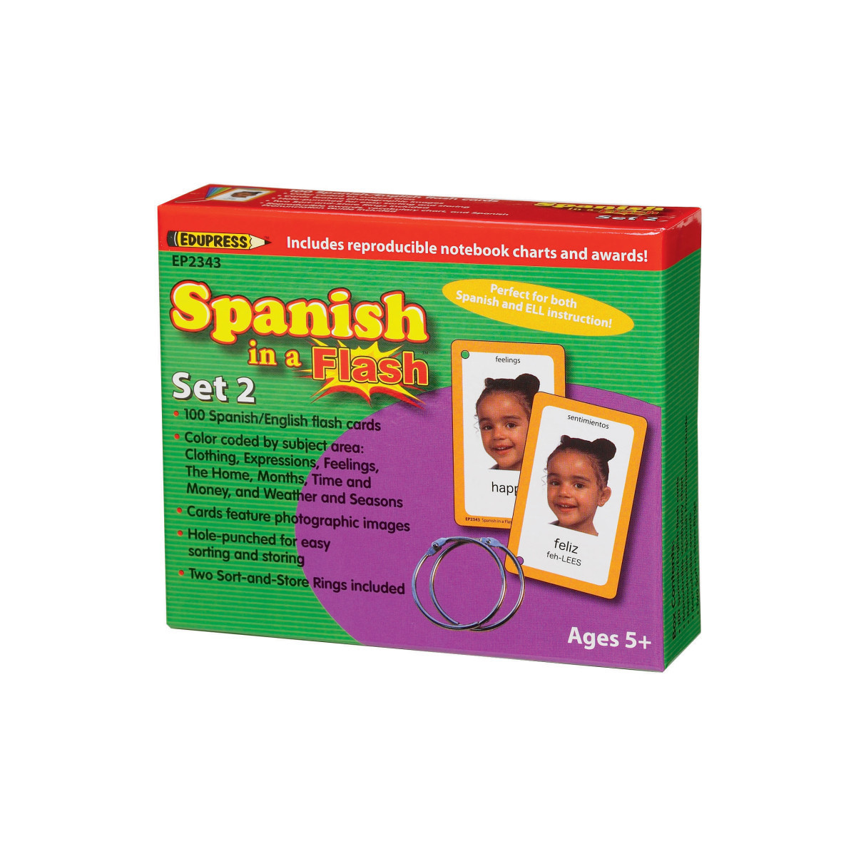 Spanish vocabulary will get a boost with these one-of-a-kind flash cards! Our famous color-coded, hole-punched learning system allows students to separate and study one group of words at a time. Stunning photographs connect vocabulary with real life, and phonetic spellings aid in pronunciation of Spanish words. Sets are perfect for use with both Spanish and ELL instruction. The UV-coated cards feature colorful borders for easy sorting and storing, durable rounded corners, and pre-drilled holes for the sorting ring. Sets include 100, 2½ x 4" vocabulary flash cards, two sort-and-store rings, a reproducible vocabulary chart and a Spanish pronunciation guide.Set 2 — Expressions, Feelings, Months, Time and Money, Weather and Seasons, Clothing and The Home.
