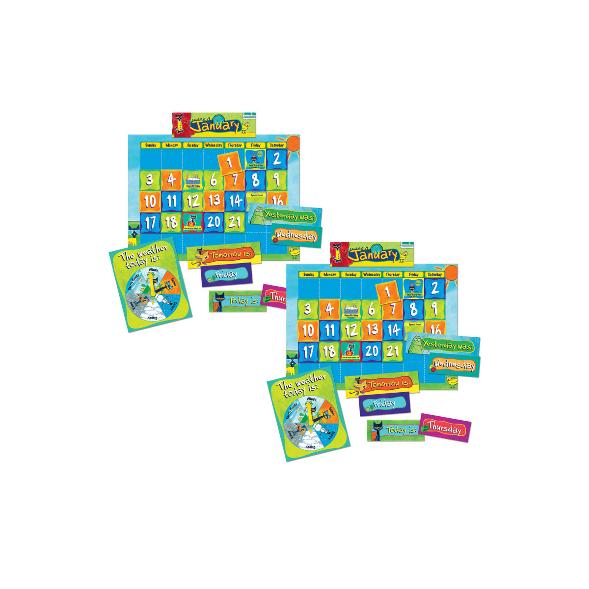 Pete and his friends help students track weeks, special days, and weather throughout the year! Blank calendar chart measures 23.75" x 17.5". Each kit includes 90 pieces. Sold as 2 calendar kits.