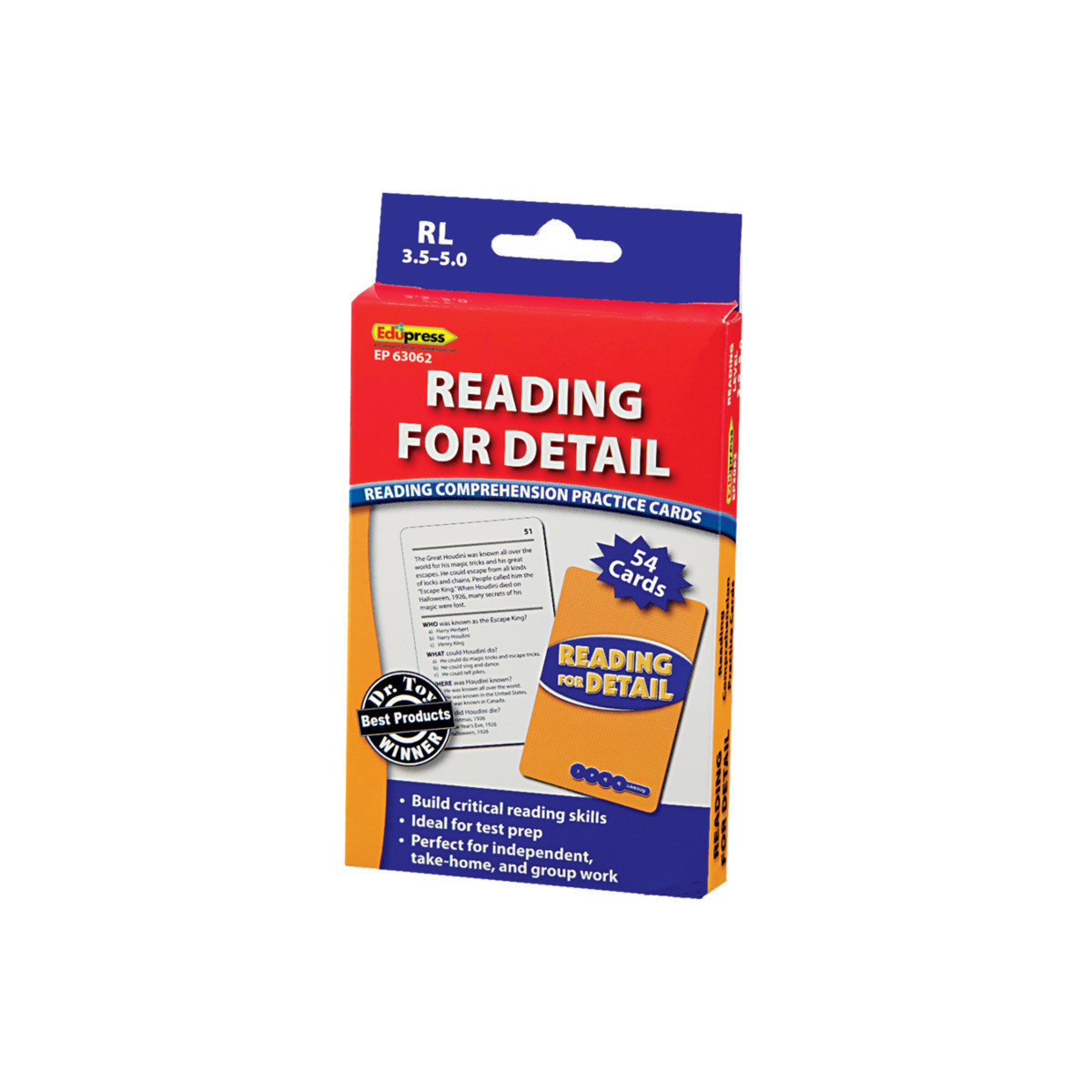 Award-winning cards help students truly understand what they read! Each self-checking card features a leveled passage and a multiple-choice question. Ideal for test prep, individual, take-home and group work. Fifteen skills available in three reading levels. 54 cards per set. Aligned with Common Core and State Standards. Supports requirements of Title I and other federally funded programs.