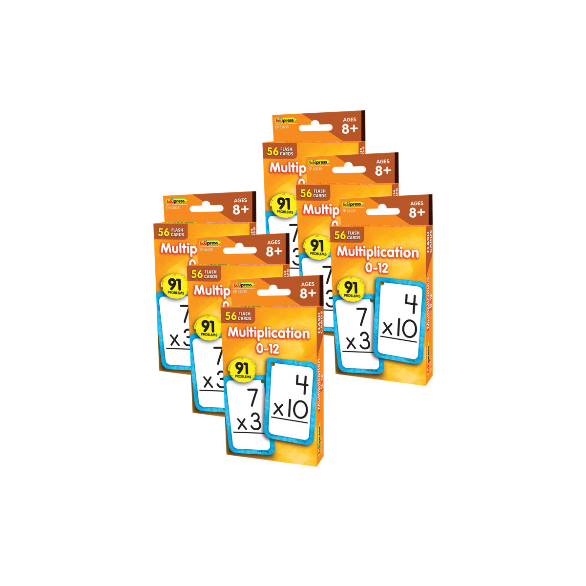 Teach and review multiplication facts individually, in groups, or with the whole class! Each flash card set contains a collection of full-color, high-interest student cards as well as instructions and tips for the teacher or parent, suggested activities, and additional blank cards. Each card has a hole in the top corner that can be fit with a ring or string to help with organization and storage. Additionally, each card has one corner that is shaped differently than the others. By lining up the non-rounded corners, the flash cards can quickly be faced in the same direction. When applicable, flash card sets include answers in small print on the reverse side of each card. Each card measures 3-1/8" x 5-1/8". Each pack includes 56 double-sided cards. Sold as 6 identical packs of flash cards.