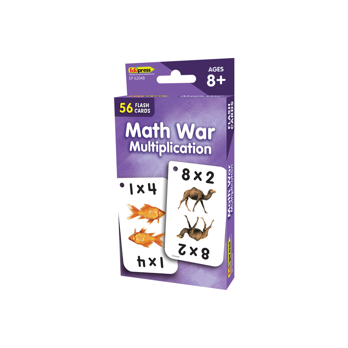 Teach and review multiplication facts with this fun card game! Each flash card set contains a collection of full-color, high-interest student cards as well as instructions and tips for the teacher or parent, suggested activities, and additional blank cards. Each card has a hole in the top corner that can be fit with a ring or string to help with organization and storage. Additionally, each card has one corner that is shaped differently than the others. By lining up the non-rounded corners, the flash cards can quickly be faced in the same direction. When applicable, flash card sets include answers in small print on the reverse side of each card. Each card measures 3-1/8" x 5-1/8". 56 double-sided cards per pack.