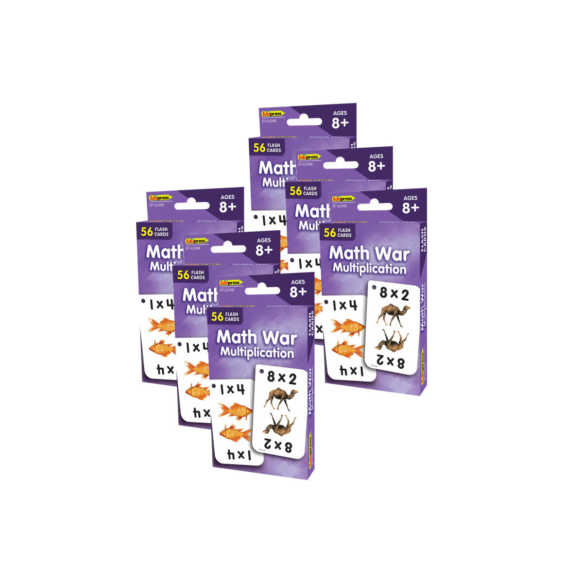Teach and review multiplication facts with this fun card game! Each flash card set contains a collection of full-color, high-interest student cards as well as instructions and tips for the teacher or parent, suggested activities, and additional blank cards. Each card has a hole in the top corner that can be fit with a ring or string to help with organization and storage. Additionally, each card has one corner that is shaped differently than the others. By lining up the non-rounded corners, the flash cards can quickly be faced in the same direction. When applicable, flash card sets include answers in small print on the reverse side of each card. Each card measures 3-1/8" x 5-1/8". Each pack includes 56 double-sided cards. Sold as 6 identical packs of flash cards.