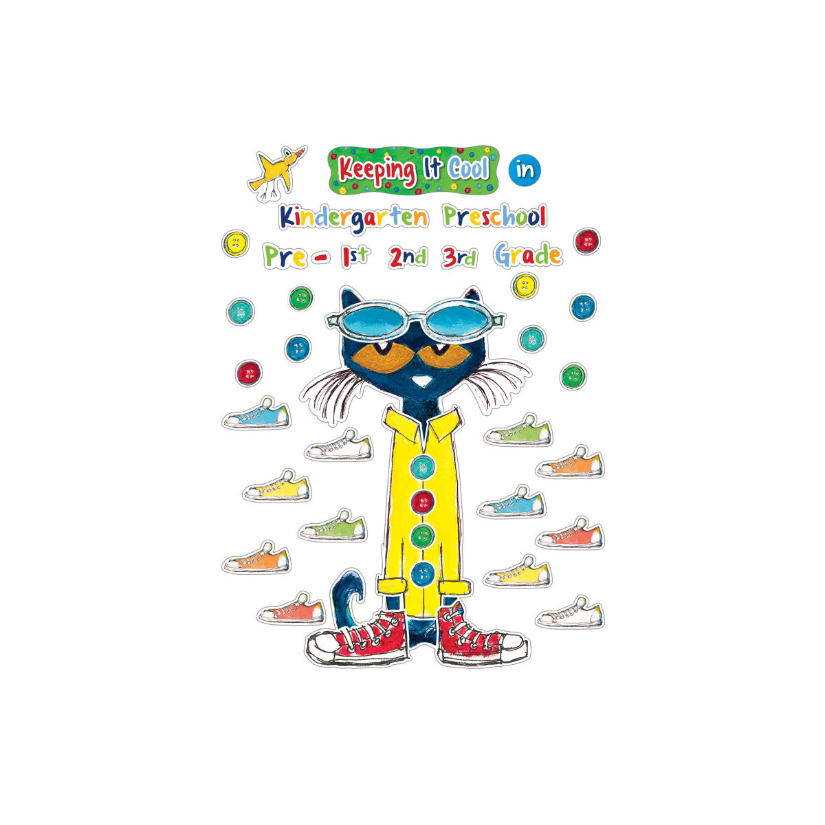This giant Pete the Cat adjustable bulletin board comes with his own accessories and is over three feet tall! You can add Pete's coat, his buttons, his shoes, and his sunglasses to illustrate his mood. The bulletin board includes additional shoes and buttons to write students' names and add them to the display. Pete measures 23" x 37-1/2" and includes 30 shoes, 16 buttons, 1 bird, and the "Keeping it Cool" header piece that can be used with any of the PreK-3rd Grade labels. Includes 65 total pieces.