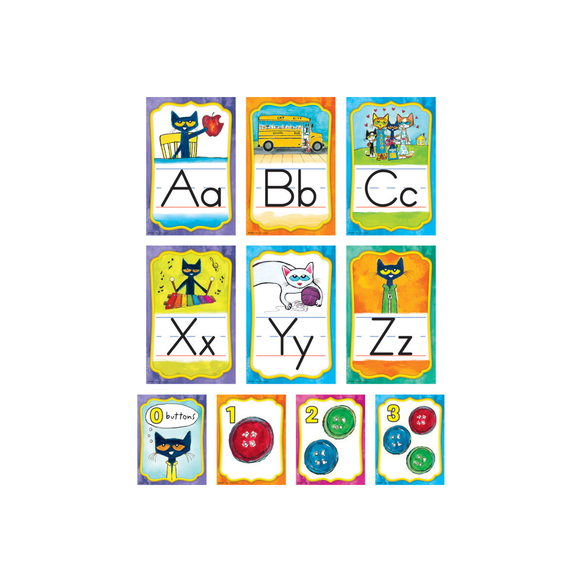 This Pete the Cat bulletin board is a colorful visual reference for students learning their alphabet and numbers. Includes 26 Alphabet Cards that measure 5-1/2" x 8-1/2" and Number Cards 0-10 that measure 4-1/4" x 5-1/2". Includes 37 total pieces.