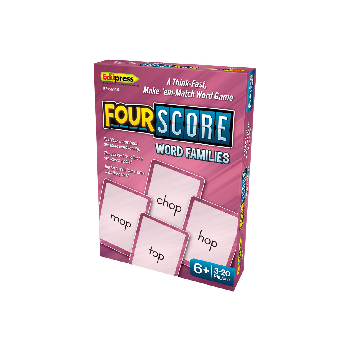 With this edition of Four Score, players will quickly learn word families.