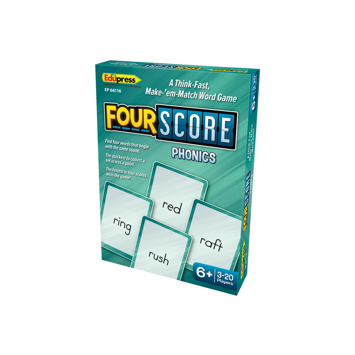 Four Score is a fun and fast paced matching game that challenges young learners. Players are dealt 4 cards and try to pass off cards they don't need while collecting all 4 words that begin with the same sound. The first player to collect all 4 parts wins the hand and 1 point. The first player to earn 4 points is the Four Score winner. Includes an instruction sheet and 80 playing cards. Players will master pronunciation with the Four Score Phonics edition. Ages 6+, 3-20 players.
