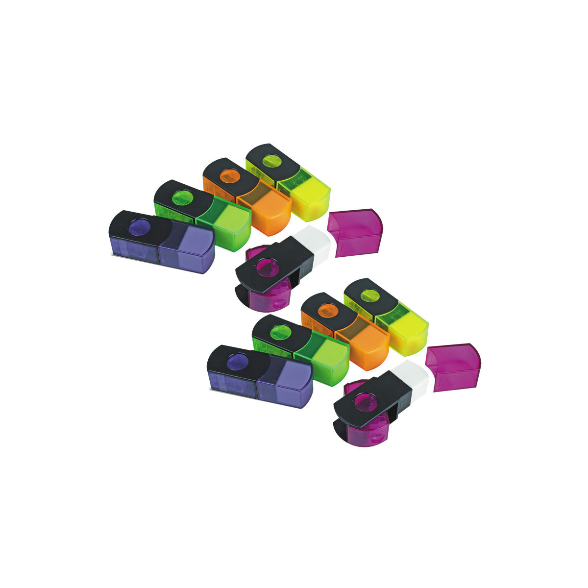 Keep your pencils sharp and erase any marks all in one! Durable eraser on one end. Flip the canister to reveal single-hole sharpener. German steel blades cleanly and easily sharpen pencils. Sold as a pack of 10 sharpeners in assorted colors (no color choice).