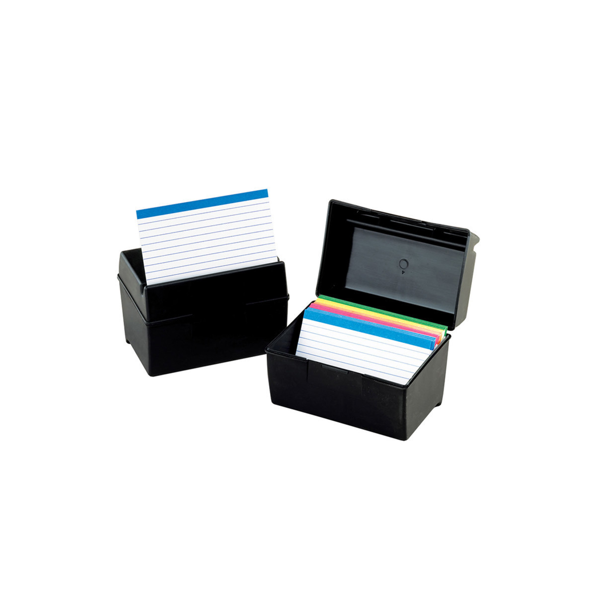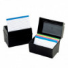 Innovative lid has a special compartment to hold cards in a propped-up position. Features an extra durable plastic construction. Each box holds 300 3" x 5" cards.