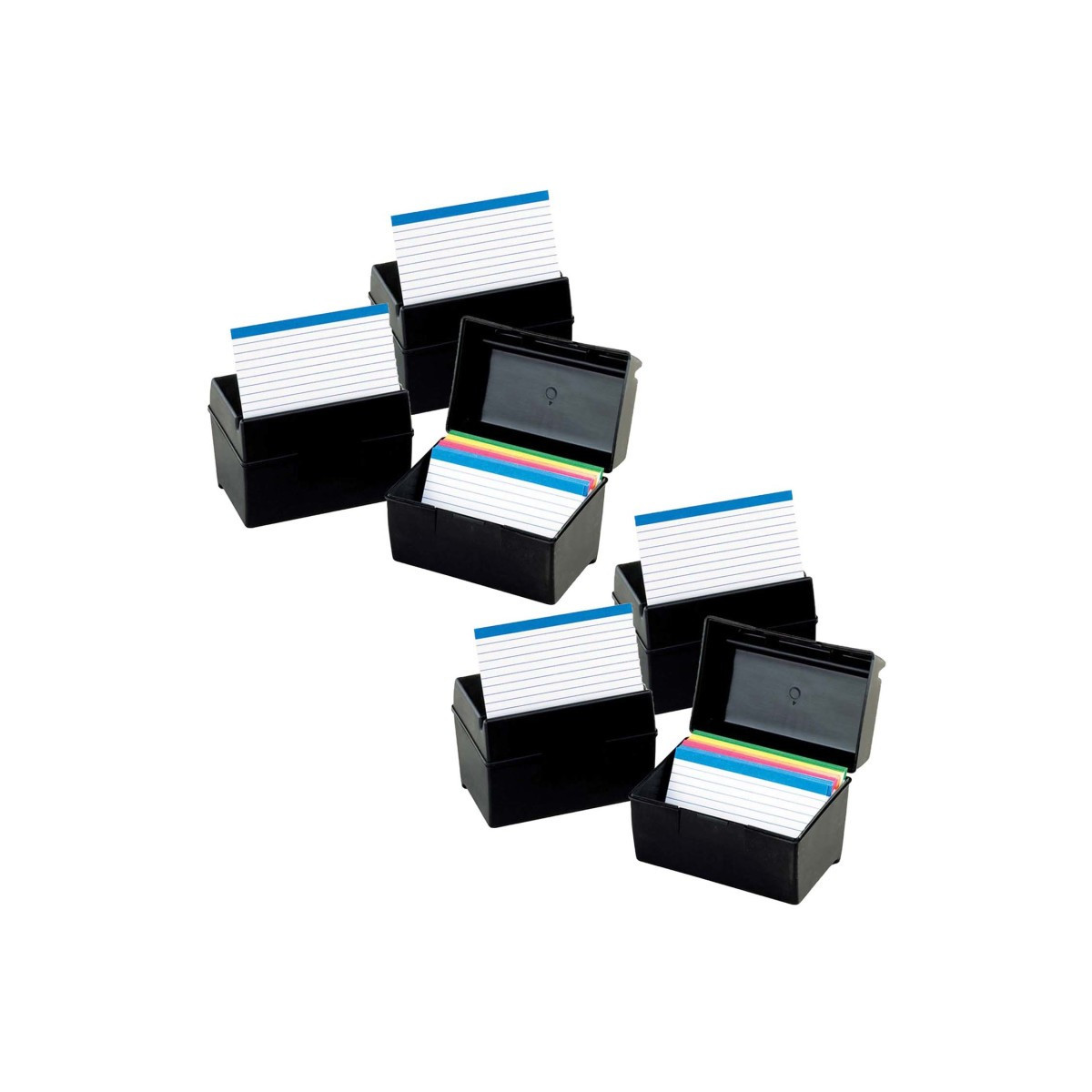 Innovative lid has a special compartment to hold cards in a propped-up position. Features an extra durable plastic construction. Each box holds 300 3" x 5" cards. Sold as a pack of 6 index card boxes.