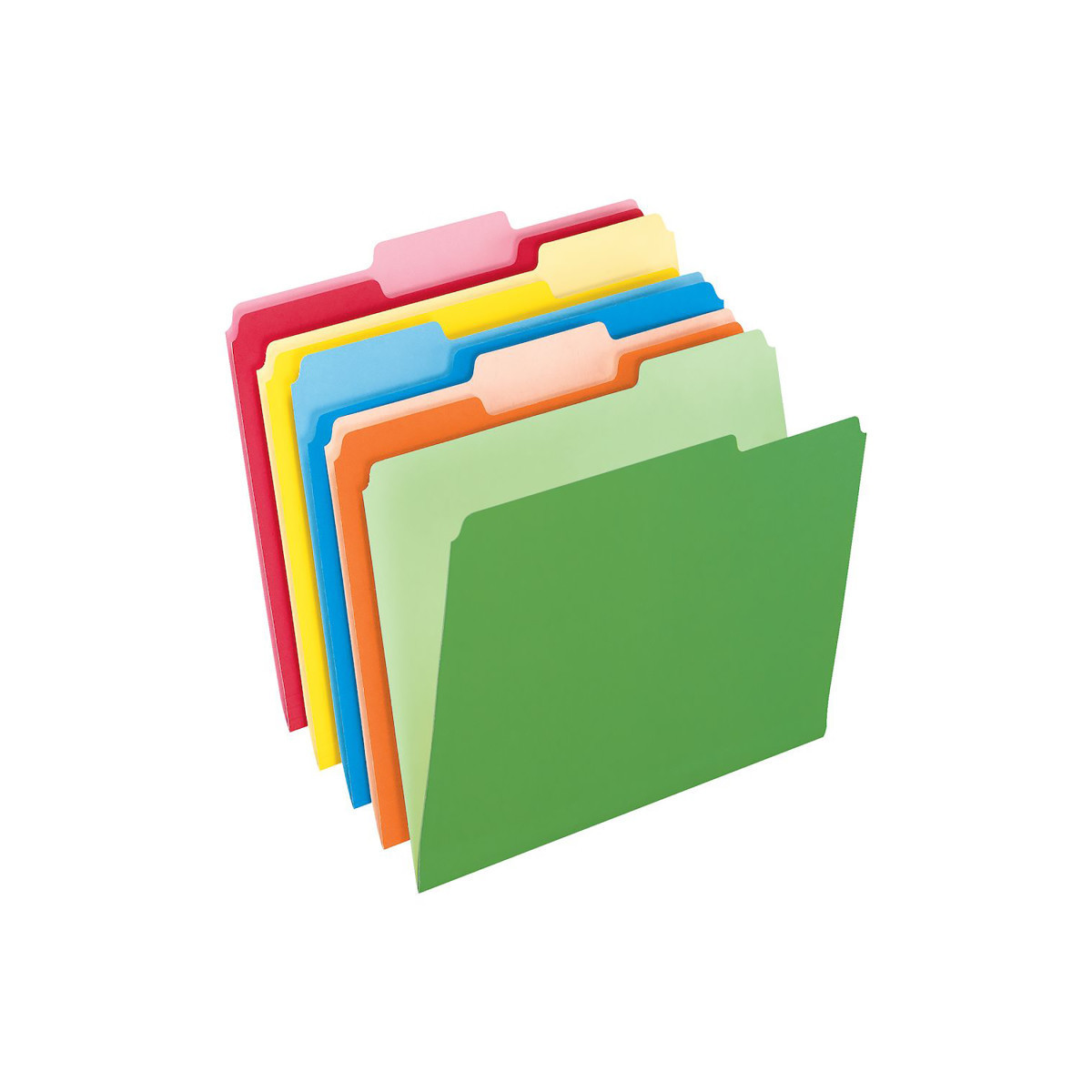 Pendaflex® Two-Tone Color File Folders come in brilliant shades with lighter interiors to prevent time-wasting misfiles. Create bright, color-coded files for fast, efficient filing or reverse them for double the color options. 1/3-Cut tabs in assorted positions. Letter size, assorted colors: bright green, yellow, red, blue, orange. 100 per box.