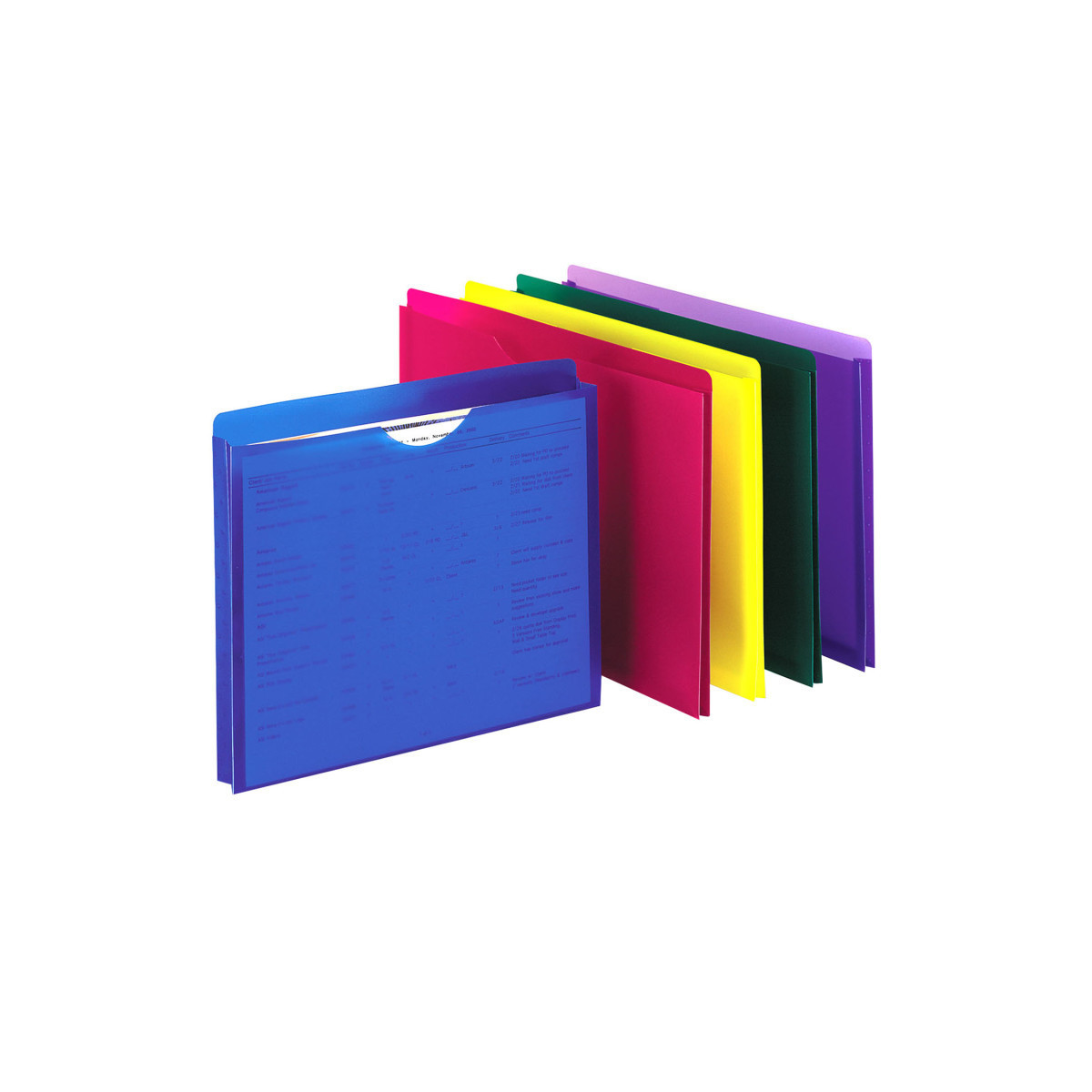 Translucent Poly File Jackets help you sort and identify files in five bright colors. Durable poly is wear-, tear- and moisture-resistant. 1” Expansion. Letter size. Assorted colors, two each: blue, green, yellow, magenta, purple. 10 Per pack.